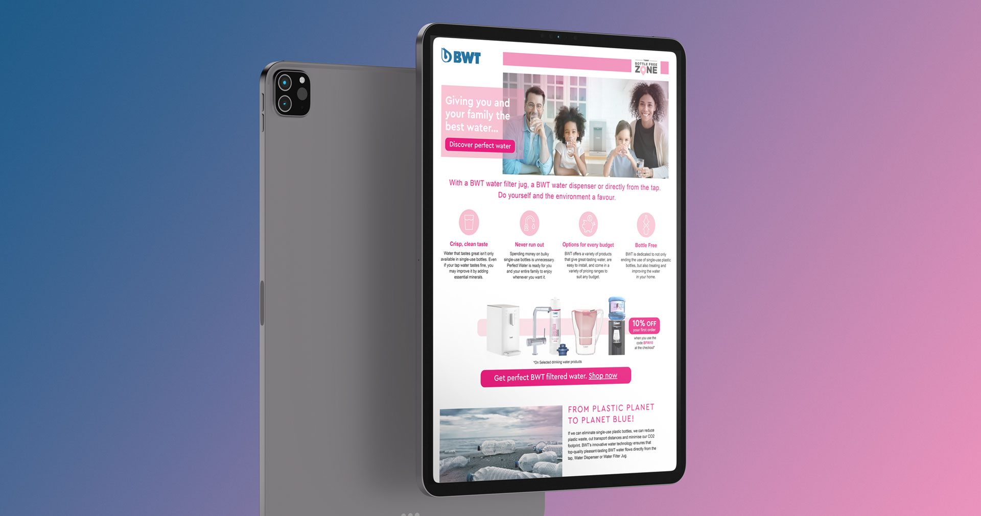 BWT provides products, systems, and services for filtering and desalinating drinking water, pharmaceutical and process water, as well as swimming pool water. The Marketing team and managing director of BWT’s UK arm work closely with our team. Through our long relationship, we have worked across all design and marketing touch points, including brochures, branding, websites, events, press, email marketing, packaging, video, and production. Our deep understanding of their brand allows us to create assets quickly and in accordance with their corporate image.